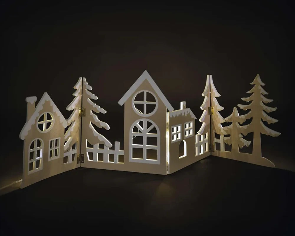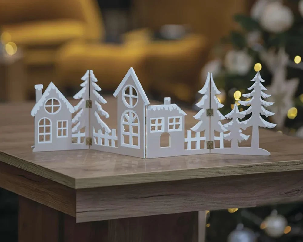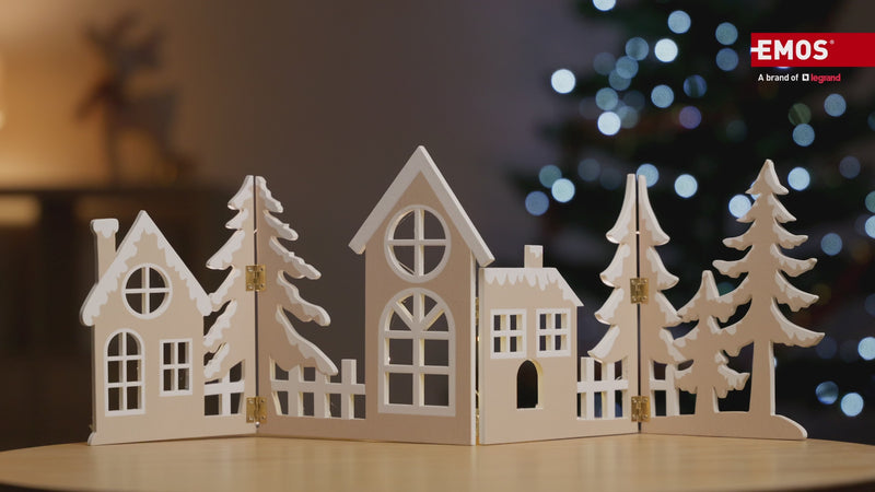 Drvena LED dekoracija u obliku božićnog sela donosi toplinu i čaroliju blagdana u svaki dom. S 40 LED dioda u toploj bijeloj boji, stvara čaroban ugođaj kroz prozore kućica. Radi na 2xAA baterije, lako se sklapa i sprema – idealna dekoracija za stol, policu ili prozor. Baterije nisu uključene.