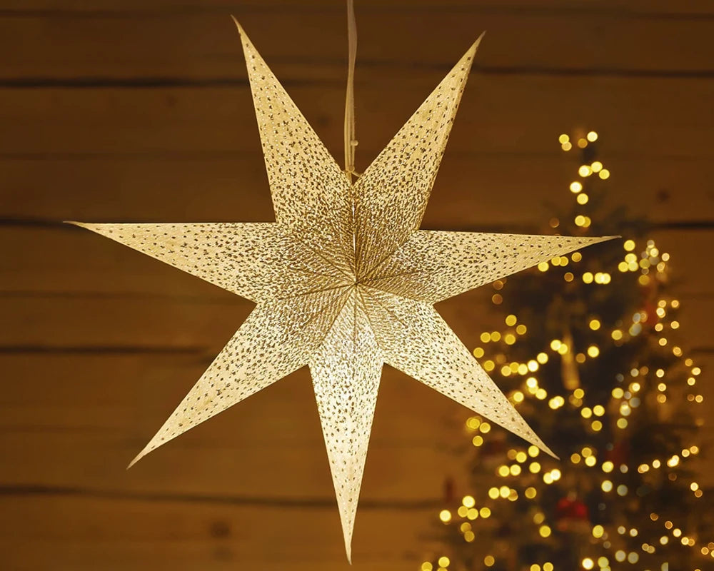 Tražite li prekrasan božićni ukras koji će u trenu unijeti toplinu i svjetlost u vaš dom? Isprobajte viseću božićnu zvijezdu izrađenu od kombinacije papira i pamuka – elegantan dodatak koji će se savršeno uklopiti u svaki interijer. S promjerom od 60 cm i kabelom duljine 3,2 metra, možete je objesiti na prozor, luster, dovratnik ili bilo koje drugo mjesto u svom domu. Zvijezda je opremljena E14 grlom za žarulju, tako da možete odabrati boju svjetla po vlastitoj želji. Ako, primjerice, odaberete bijelu zvijezdu i u nju stavite žarulju s toplim bijelim svjetlom, ona će zasjati prekrasnim zlatnim sjajem koji će se nježno probijati kroz sitne perforirane otvore. Dodatna prednost? Jednostavno sastavljanje! Dovoljno je samo zategnuti vrpcu i spremna je za upotrebu.