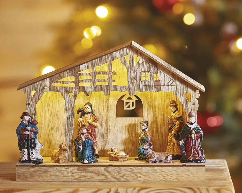 Drvene božićne jaslice s LED osvjetljenjem visine 19 cm unose toplinu i tradiciju u svaki dom. S toplo bijelim svjetlom, napajanjem na 3xAA baterije i timer funkcijom (6h ON / 18h OFF), stvaraju ugodnu i svečanu blagdansku atmosferu. Idealne za komodu, prozor ili blagdanski stol. Baterije nisu uključene.