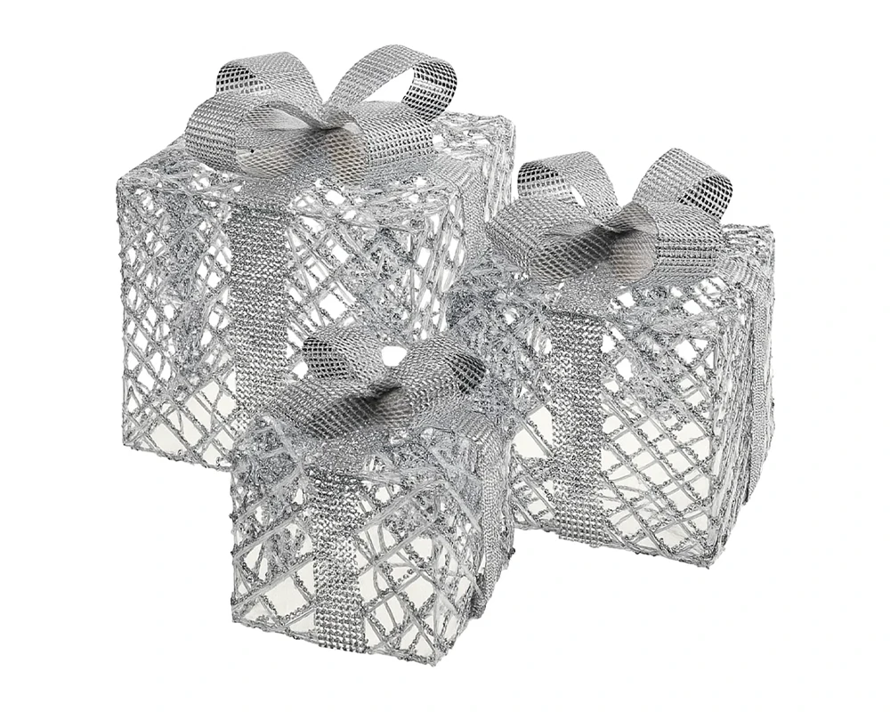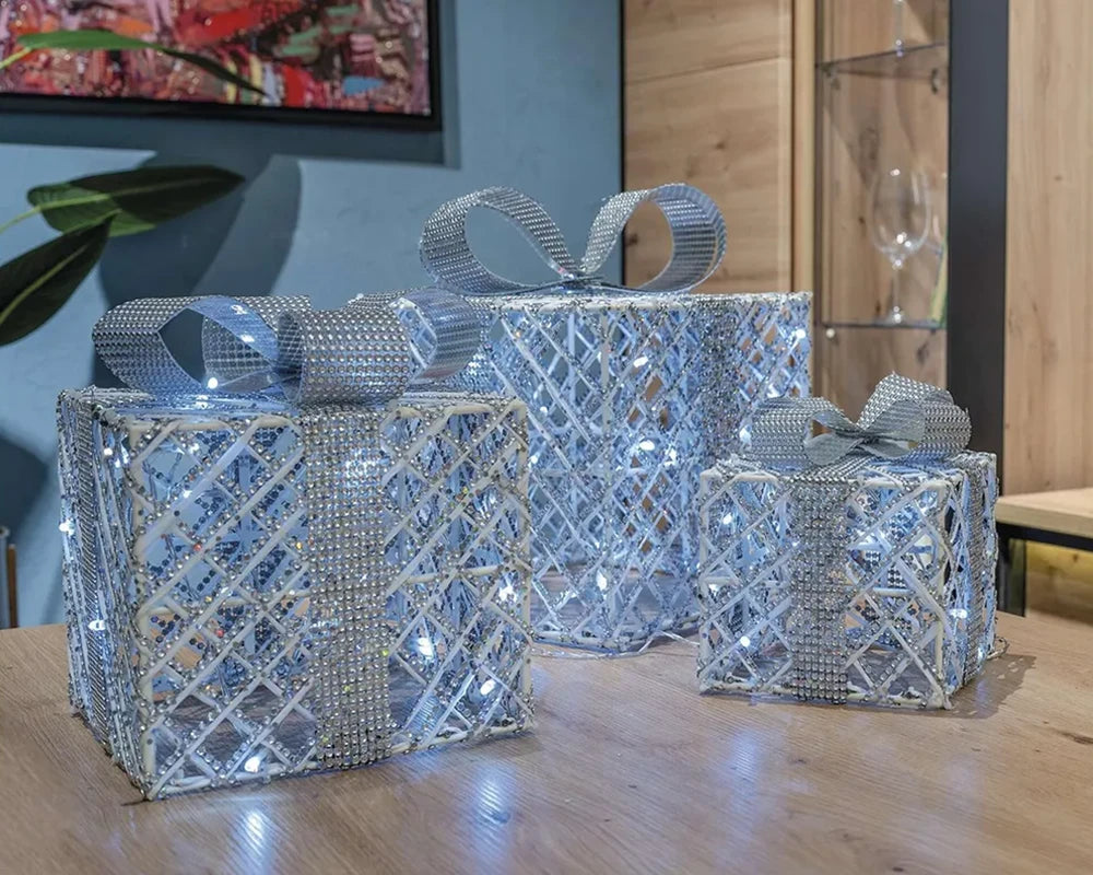 Set od tri LED božićna poklona u srebrnoj boji (visine 15, 20 i 25 cm) unosi eleganciju i sjaj u svaki dom. S hladno bijelim svjetlom, timer funkcijom (6h ON / 18h OFF) i kablom duljine 3 m, idealni su za postavljanje kraj bora, na komodu ili u hodnik. Stvaraju čarobnu i toplu blagdansku atmosferu.