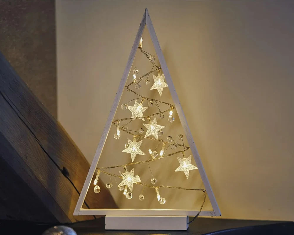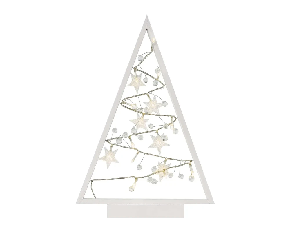 Drvena božićna dekoracija u obliku drvca visine 40 cm unosi toplinu i tradiciju u dom. Opremljena LED svjetlom u toploj bijeloj boji i timer funkcijom (6h ON / 18h OFF), stvara ugodnu blagdansku atmosferu. Radi na 2xAA baterije, pa ju možete postaviti bilo gdje u interijeru. Baterije nisu uključene.