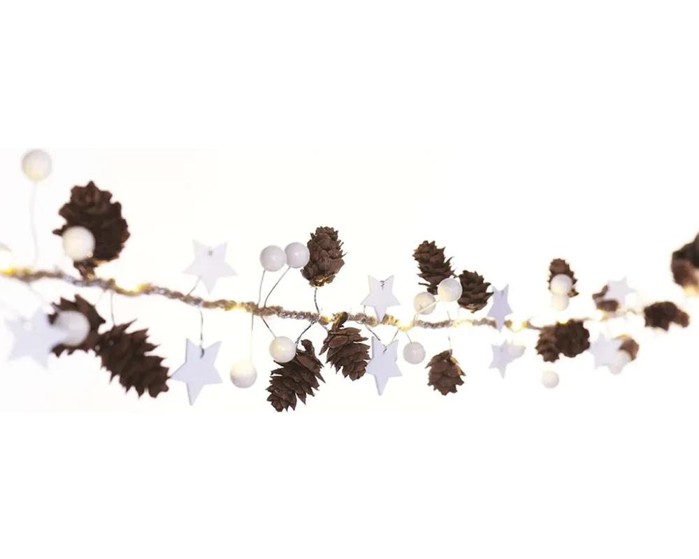 Božićna LED girlanda s češerima duljine 1,7 m donosi toplinu i prirodan blagdanski ugođaj. S toplo bijelim svjetlom i napajanjem na 2xAA baterije, idealna je za dekoraciju prozora, stolova, vijenaca ili dječjih soba. Jednostavna za postavljanje – bez potrebe za utičnicom. Baterije nisu uključene.