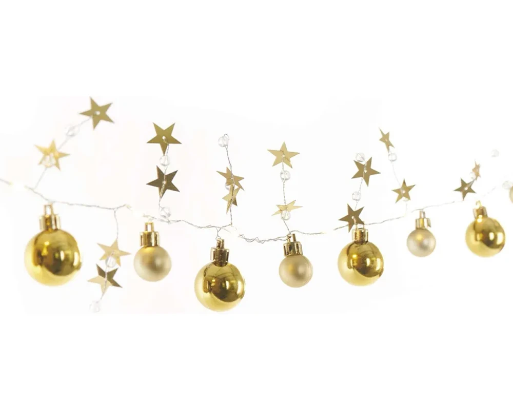 Božićna girlanda, zlatne kugle sa zvijezdama, LED, toplo bijela, 2xAA, IP20, 1.9m