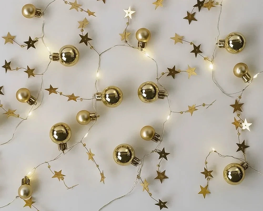 Božićna LED girlanda sa zlatnim kuglicama i zvjezdicama duljine 1,9 m donosi toplu, elegantnu blagdansku atmosferu u svaki dom. S toplo bijelim svjetlom, napajanjem na 2xAA baterije i timer funkcijom (6h ON / 18h OFF), idealna je za dekoraciju prozora, stolova, vijenaca ili dječjih soba – bez potrebe za utičnicom. Baterije nisu uključene.