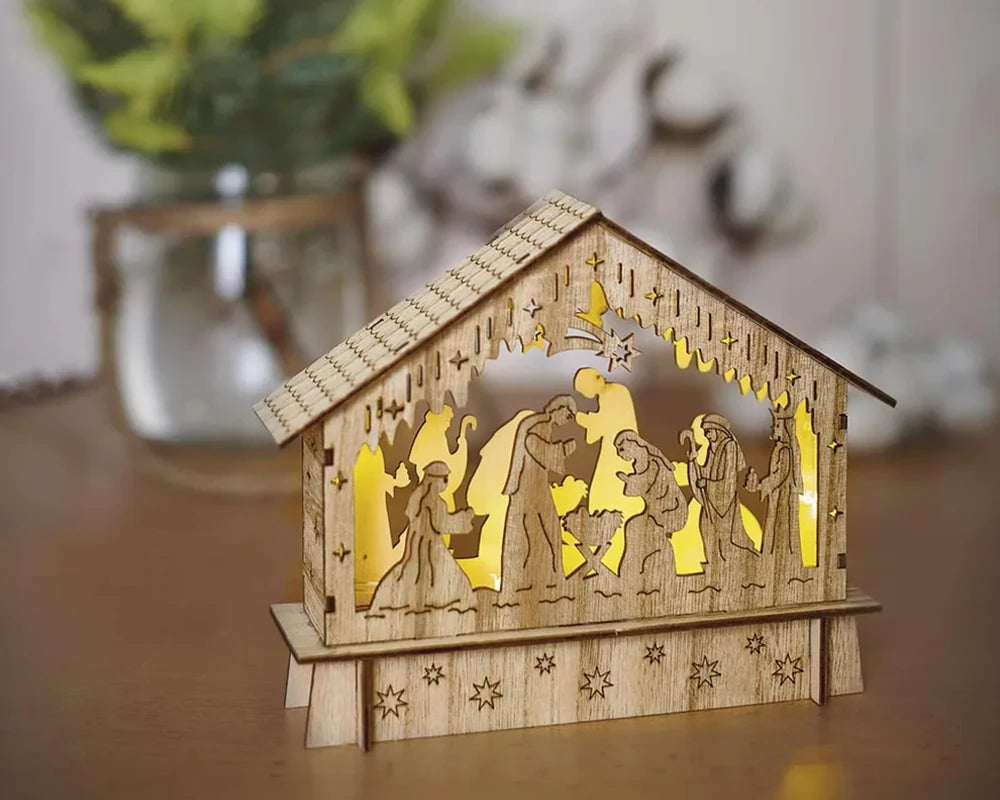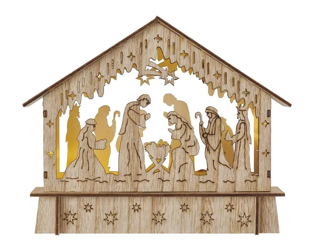 LED Christmas nativity scene, indoor, wooden, warm white, timer, 2xAA, 15cm